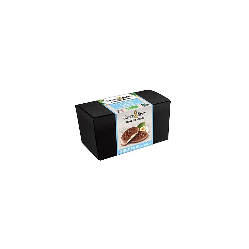 Chocolat au LAIT* (sucre de canne*, beurre de cacao*, poudre de LAIT entier*, pâte de cacao*), poudre de LAIT*, sucre de canne*, BEURRE concentré*, beurre de cacao*, NOISETTES*, farine de riz*, farine de maïs*, extrait de vanille*, agent d’enrobage : gomme arabique*.