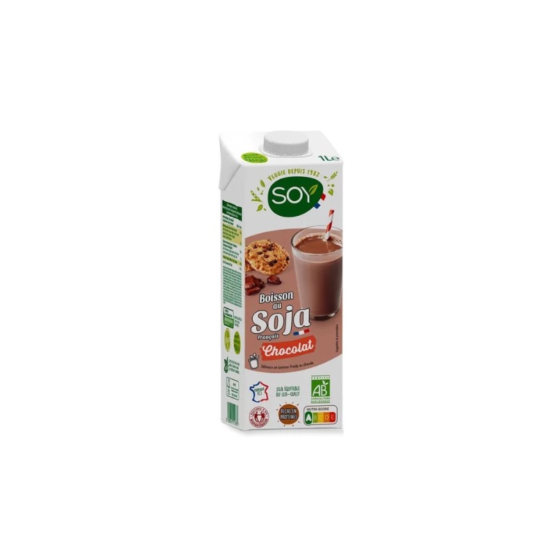 Jus de soja* 90,6% (eau, graines de soja*(1)(2)), sucre de canne non raffiné*(2), chocolat en poudre* 2,2% (sucre de canne non raffiné*(2), cacao en poudre*(2), cacao maigre en poudre*(2) 1%, farine de riz*, jus de pommes concentré*, stabilisants : (gomme xanthane), sel de mer.