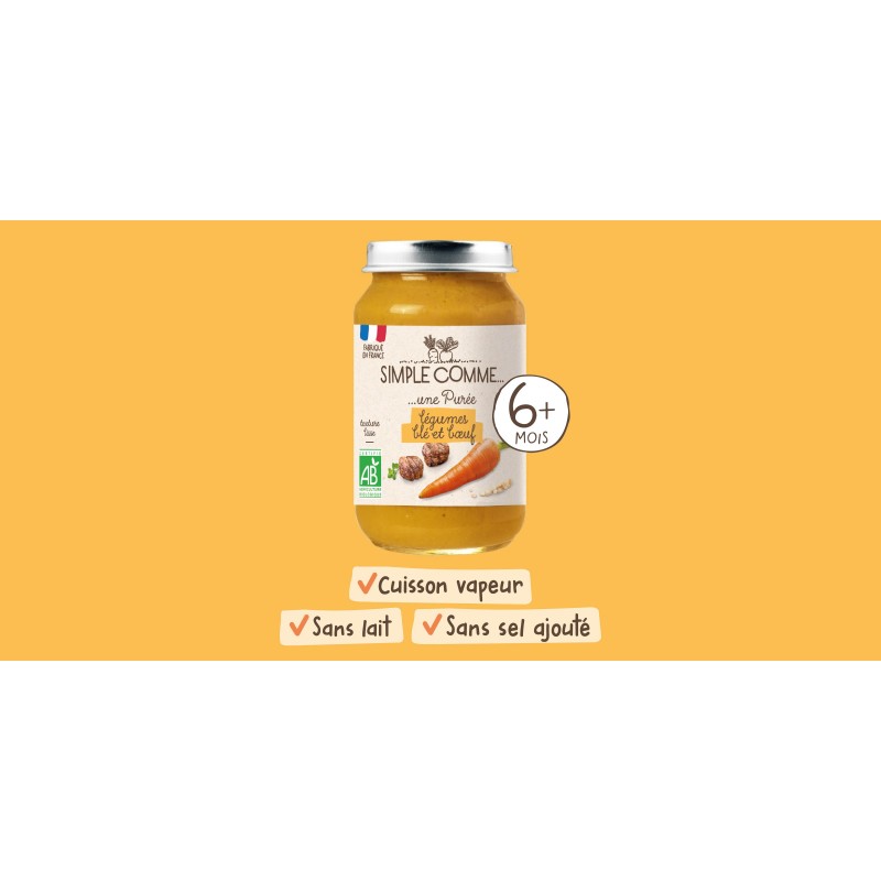 Des carottes* 35%, de I’eau de cuisson, du bIé cuit* 13% (eau, bIé*), de Ia purée de tomates*, de Ia viande de boeuf* 8%, des oignons*, de I'origan*, et c’est tout !