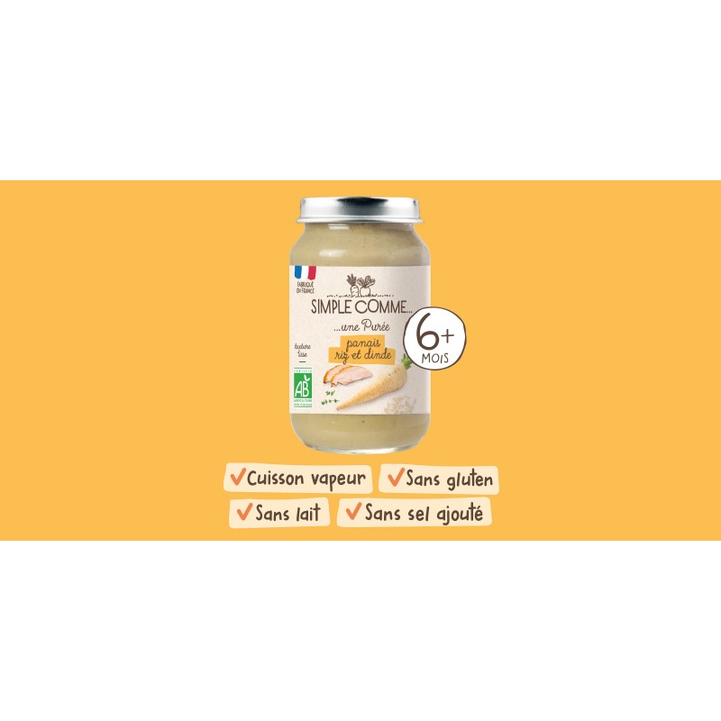 De I’eau de cuisson, du panais* 25%, du riz cuit* 16% (eau, riz*), des pommes de terre*, de Ia viande de dinde* 8%, des oignons*, du thym*, et c’est tout !