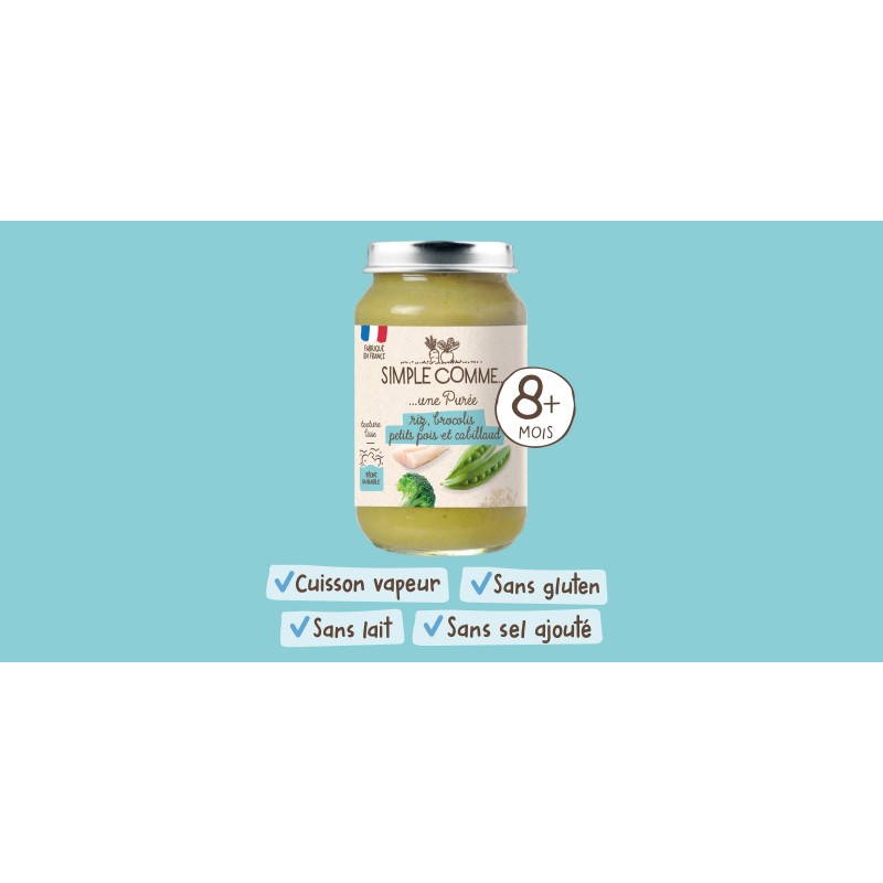 De l'eau de cuisson, du riz cuit* 21% (eau, riz*), des brocolis* 13%, des petits pois* 13%, des pommes de terre*, des oignons*, du cabillaud sauvage 8,5%, de l’aneth*, et c’est tout !