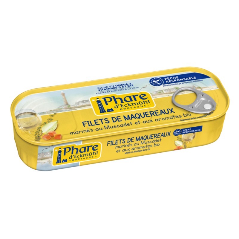 Filets de MAQUEREAUX (Scomber scombrus) 57%, eau, vinaigre de vin blanc*, oignons* 4%, carottes* 4%, vin blanc Muscadet (SULFITES)* 2,4%, cornichons au vinaigre* (cornichons* 2%, vinaigre d’alcool*, sucre de canne*, sel), poivrons rouges* 2%, sel, vinaigre d’alcool*, persil* 0,12%, laurier* 0,06%, thym* 0,02%.