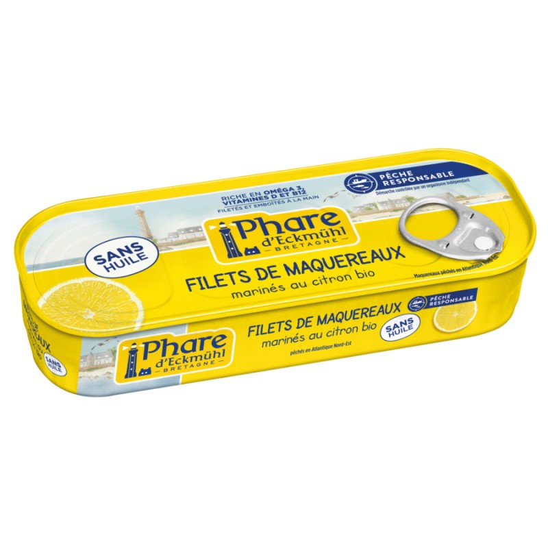 Filets de maquereaux (Scomber scombrus) 56%, eau, citron* 7,4% (pulpe*, rondelle* et jus concentré*), vinaigre d'alcool*, sel.