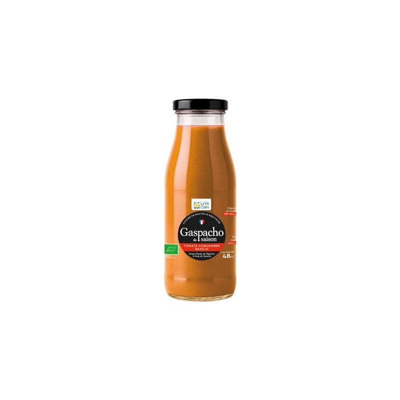 Tomate*, eau, concombre*, poivron*, oignon*, basilic*, huile d'olive*, huile de tournesol*, vinaigre*, ail*, sel.