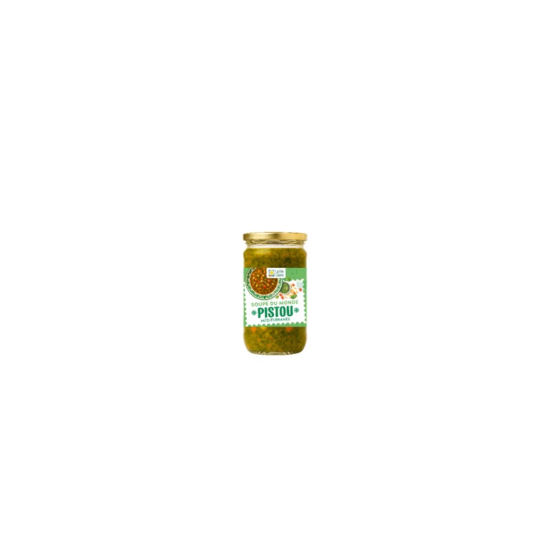 Eau, pulpe de tomates* 15,6% (tomate*, jus de tomate*, acidifiant : acide citrique), courgettes* 8,1%, pommes de terre*, pistou* 6.8% (huile d'olive*, basilic* 2,1%, ail*, huile de tournesol*), carottes* 3,2%, haricots verts* 3,2%, haricot blancs* 2,4%, oignons* 1%, COQUILLETTE* (BLE), double concentré de tomates* 0,9%, haricots rouges * 0,5%, sel marin, thym*, poivre*.