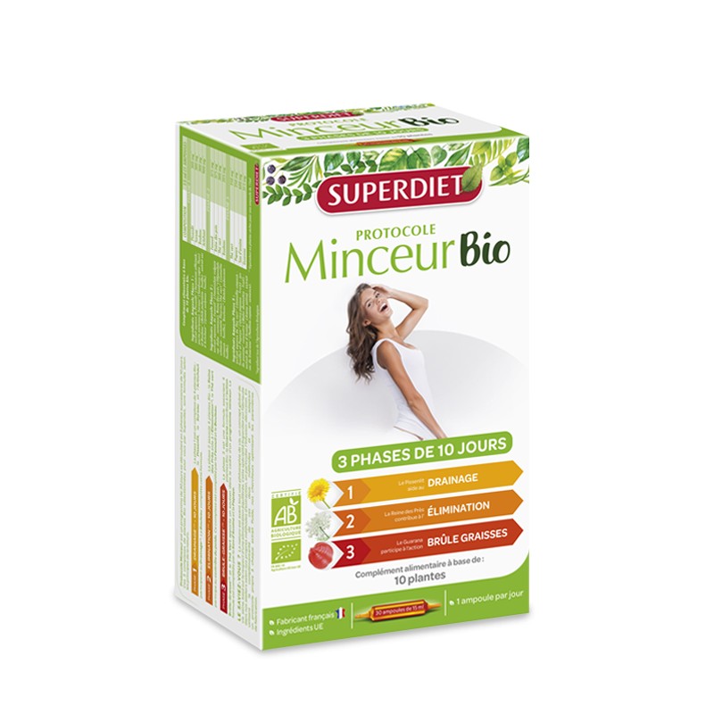 Protocole Minceur est un programme de 30 jours se déroulant en 3 phases successives de 10 jours. Ces 3 complexes de plantes Bio sont formulés selon les principes de la naturopathie à base de plantes sélectionnées pour vous par les Laboratoires SUPERDIET.
