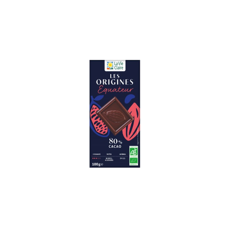 Pâte de cacao*, sucre de canne*, beurre de cacao*, vanille en poudre*. 80% de cacao minimum.