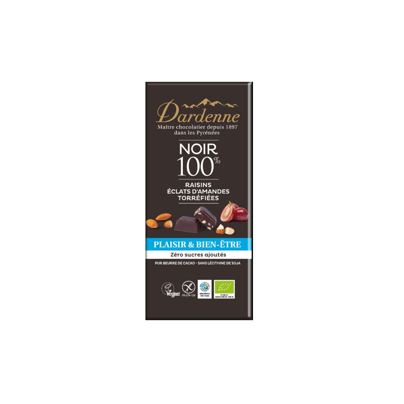 Masse de cacao*, Raisins secs* (raisins sultanines*, huile de tournesol) (20 %) éclats d'amandes torréfiées* (10 %) beurre de cacao*, Cacao : 100%