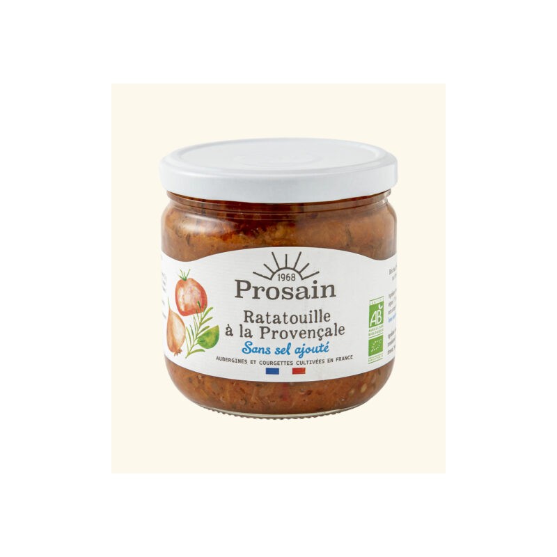Tomate* 28% (dés de tomates*, pulpe de tomate au jus*, double concentré *), aubergines* 25%, courgettes* 17%, poivrons* rouges 10%, oignons*, huile de tournesol* désodorisée, ail*, huile d’olive* vierge extra, miel*, persil*, thym* 0,14%, jus concentré de citron*, romarin*, laurier*, origan*, poivre*.