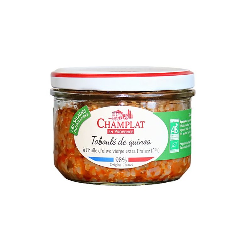 Quinoa blanc* réhydraté 30% (quinoa blanc*, eau), tomates*, purée de tomates*, oignons*, huile d'olive vierge extra* 5%, menthe*, persil*, jus de citron concentré*, sel de Camargue.