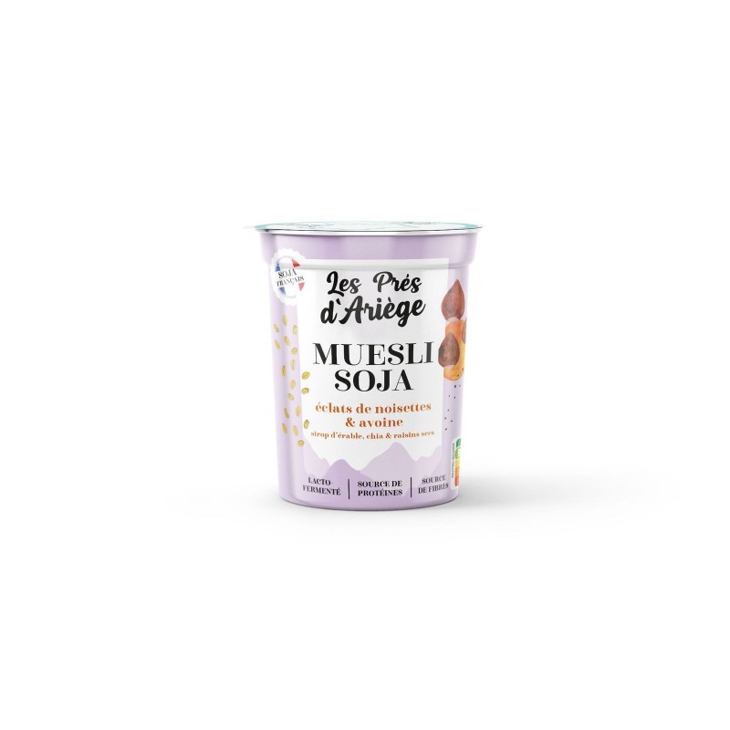 Jus de soja* 82,9% (eau, soja* du Sud-Ouest 10,2%), sirop dérable* 7,0%, flocons d'avoine* sans gluten 4,0%, noisettes grillées en morceaux 2,0%, sucre de canne blond* équitable, raisins de Corinthe 1,0%, graines de chia 0,6%, fibre de racine de chicorée*, ferments sélectionnés dont Bifidus.